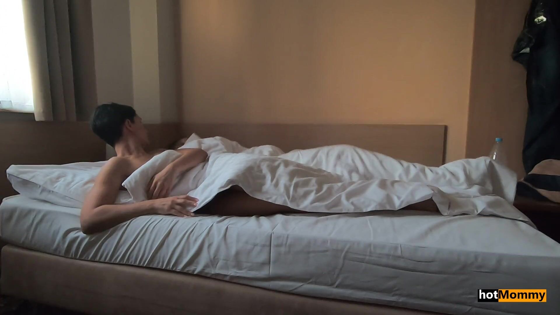 Оказавшись в отеле Ева заметила что там только одна кровать, а заказывали они две. Ну что же пришлось речь спать вместе, но есть один нюанс, Ева привыкла спать голой да и её сын тоже. Когда они легли в кровать, то сын почувствовал что у него стояк и он стал трогать свою спящую мать. Вдруг она проснулась и предложила сыну быстрый перепихон с минетом.